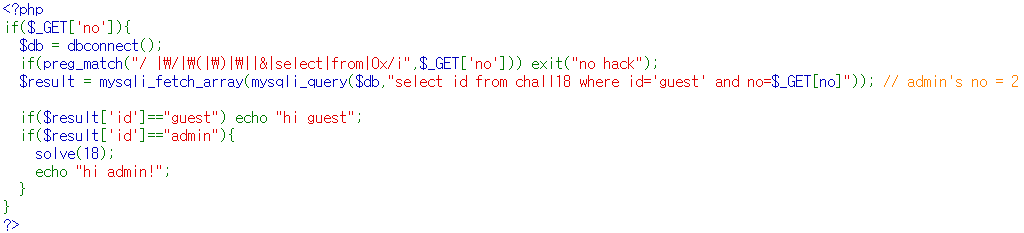 preg_match 부분에서 특정 문자들을 걸러내고, no hack을 출력한다.