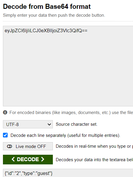 총 3번의 Decoding을 거쳐, id -> 2, type -> guest란 값이 출력되었다.