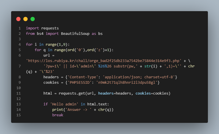 Query: ?pw=1' || id='admin' %26%26 length(pw)=8%23