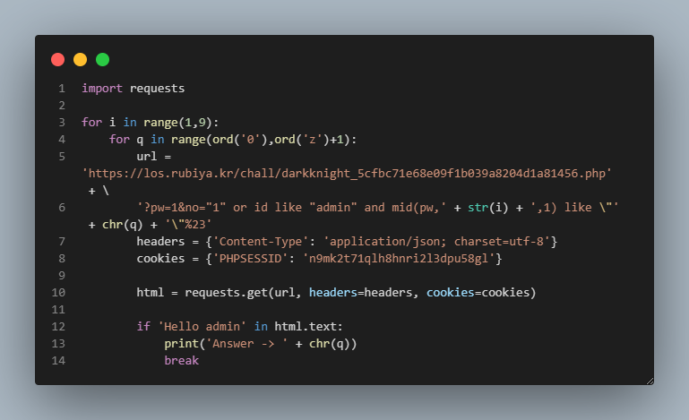 이제 파이썬 코드를 이용해 pw값을 알아내자. 마찬가지로 대소문자에 유의하자.