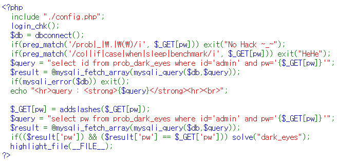 이번 문제는 전 문제와 똑같은 Error Based SQLi지만, if문이 Filtering 규칙에 포함이 되어있다.