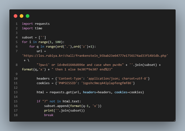 Query에 pw>0x71이란 값이 들어가게 된다면, 당연하게도 case문은 참을 뱉어낸다.