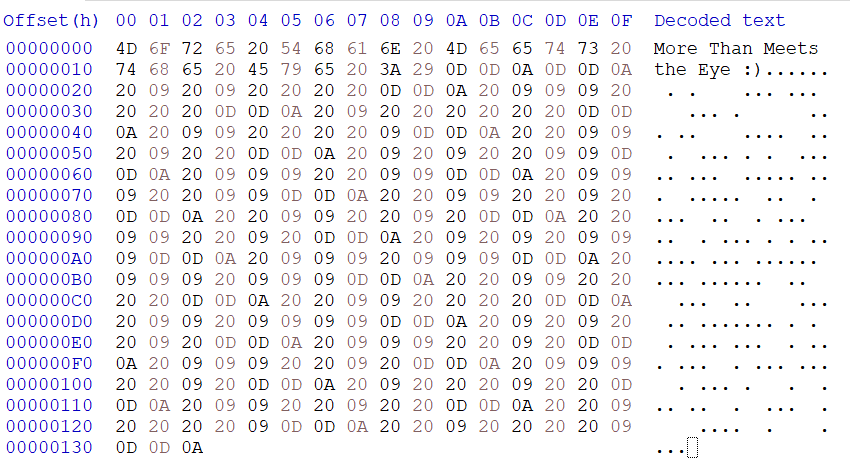 그러나 HxD에 파일을 넣어보거나 Crtl+A로 전체 선택을 한다면 공백 문자가 존재함을 알 수 있다.