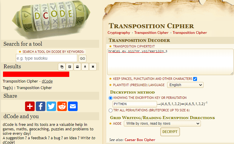 Trasnposition Cipher이다. Decoder에 돌려보자.