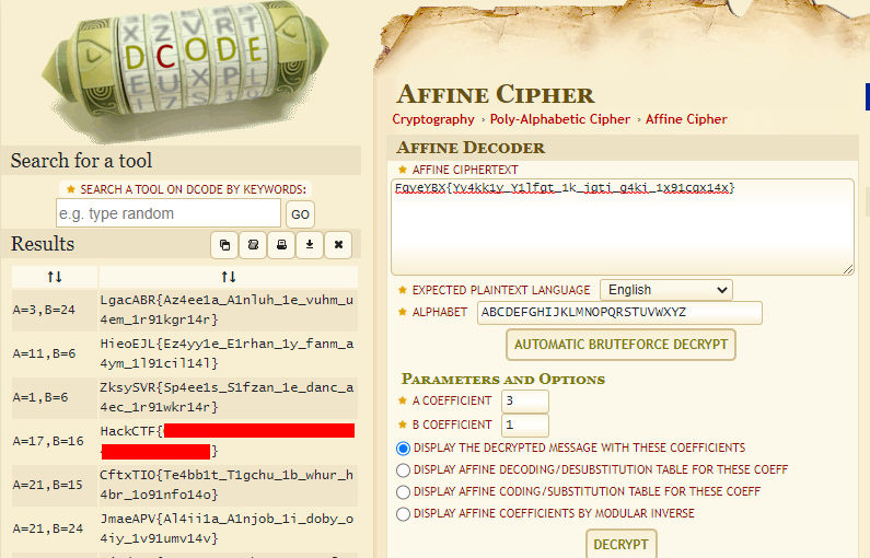 음.. 뭔가 flag 형식처럼 생겼다. Affine Decoder에 돌려보자.
