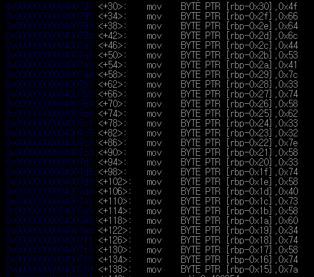 그리고 xor 레지스터가 존재하는 걸 봐서는, 저 문자열과 어떤 key가 XOR 연산을 수행하면 flag가 나올듯하다.