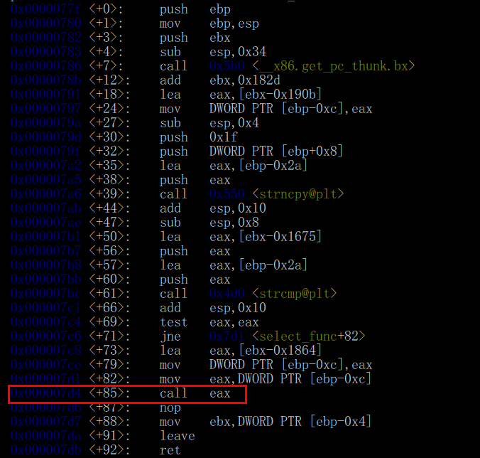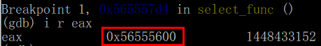 select_func 끝 부분에서 eax를 call 한다. eax에는 함수의 반환 값이 저장되는데, 이 부분에 bp를 걸고 eax 값을 확인하자.