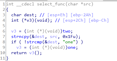 select_func 함수는 포인터 함수 v3에 two를 일단 넣고, src를 복사한 dest가 one이면 one을 리턴, one이 아니면 two를 리턴한다. 여기서 리턴 함수가 one, two가 아니라 print_flag라는 함수라면?