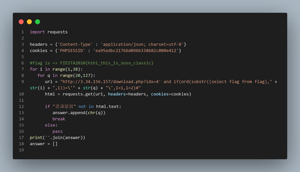 해당 쿼리문 뒤에 참 값을 넣어주면 정상적으로 파일이 다운로드 받아지고, 거짓이 들어갈 경우, 파일이 다운로드 되지 않는 다는 점을 이용해 Blind SQL Injection을 수행할 수 있었다.