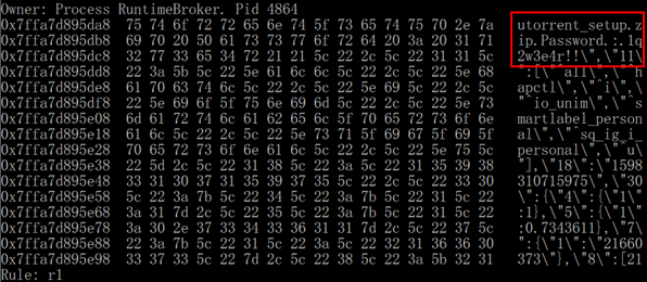 Windows Defender 실시간 검사를 Off 하면, utorrent_setup.zip이 정상적으로 다운로드된다. zip 파일의 압축을 해제하려 하니, 패스워드가 걸려있었다. zip 파일의 패스워드는 Evidence-1에서 사용한 Volatility의 yarascan 옵션으로 찾을 수 있었다.