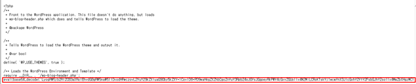 /var/www/html/wordpress/index.php의 내용이다. 사진에는 잘 보이지 않지만, eval 함수가 들어간 코드가 있음을 발견했다. 해당 Base64 문자열을 Decode 한 내용은 다음과 같다.