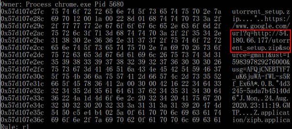 이제 유포지 주소를 찾기 위해 Volatility의 yarascan 옵션을 사용했다. yara-rules에 utorrent_setup이라는 rule을 추가하였다.