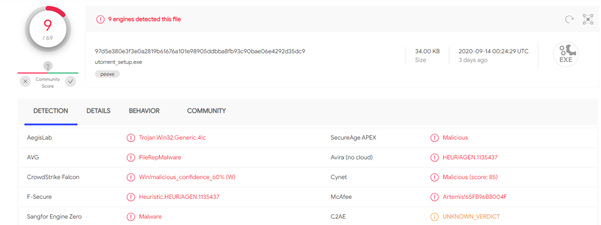 압축을 해제하면 utorrent_setup.exe 파일을 얻을 수 있다. 해당 파일을 virustotal에 검사해봤다.