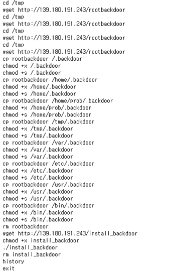 wget을 이용해, rootbackdoor을 다운로드하고, 원하는 장소에 cp를 통해, 복사한 후, x,s 권한을 줬음을 알 수 있다. Forenlog-2 문제는 백도어의 절대경로를 알아내는 문제이므로, 해커가 rootbackdoor을 복사한 위치를 나열한다면 문제를 해결할 수 있다. ~/.bash_history에는 사용자가 명령어를 입력한 순서대로 저장되기 때문에, 문제에서 제시한, 나온 시간순으로 배열하시오는 굳이 신경 쓸 필요가 없다.