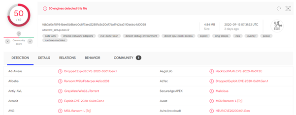 Dropped:Exploit, CVE-2020-0601이라는 CVE ID를 확인할 수 있다. 해당 CVE-2020-0601의 내용을 확인해봤더니, ECC 인증서의 유효성을 검사하는 부분에서 인증서의 검증이 미흡하여 발생하는 취약점으로, 해커가 Spoofing 된 인증서로 악의적인 실행 파일이나 웹 사이트에 서명하면 Windows가 신뢰할 수 있게 만드는 취약점이라고 한다.