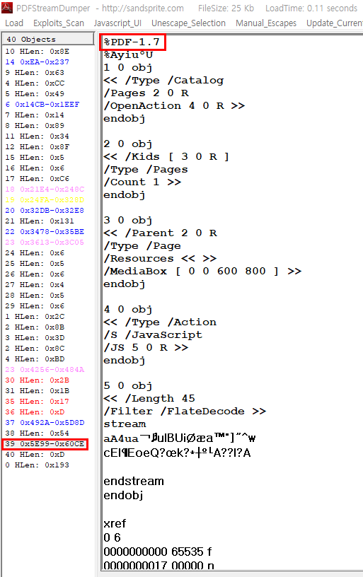 Decrypt된 PDF를 다시 PDFStreamDumper 으로 열어보자.