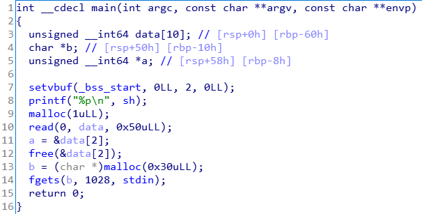 To analyze the code, print the address of sh function and call malloc(0x1). However, it can't get only 1 space allocated to the heap, so it will be allocated as much as 0x10, which is the minimum size, and call read(0, data, 0x50). There's no overflow here.
