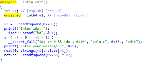 and we can exploit fd value of freed chunk using edit func. so we can write __malloc_hook with one_shot