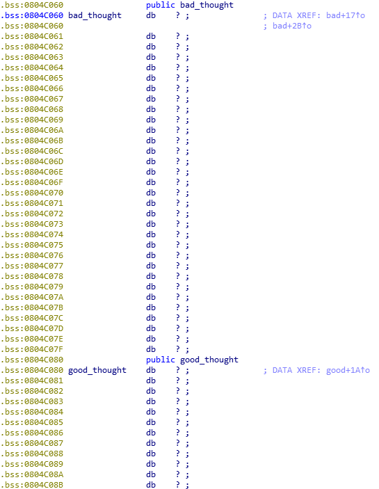 Only using bad func, we can't attack BOF vulnerability. (Length of bad_thought is 0x20 and dest variable exists at [ebp - 0x28])