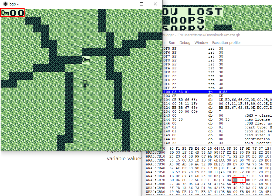I guessed that there would be a routine to eat the key here. In fact, opening the ROM debugger, we can see the variable values associated with the order in which we get the key.