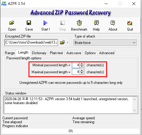 암호가 걸려있다. 저기서 압축 비밀번호는 4자리 정수라고 하니 ZIP Password Recovery를 이용해 암호를 풀어보겠다.