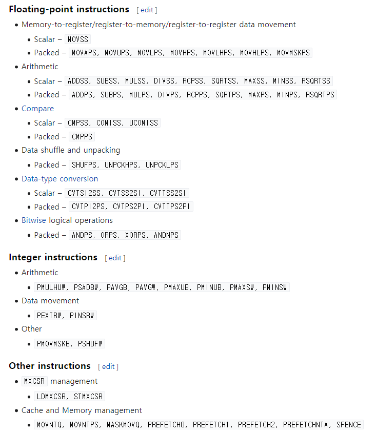 ๋จผ์ xmm ์ข ๋ฅ ๋ ์ง์คํฐ๋ SIMD ์ฐ์ฐ์ ํ ๋ ์ฌ์ฉํ๋ ๋ ์ง์คํฐ ์ด๋ค. SSE Instruction์๋ ๋ค์๊ณผ ๊ฐ์ ์ข ๋ฅ๊ฐ ์๋ค.