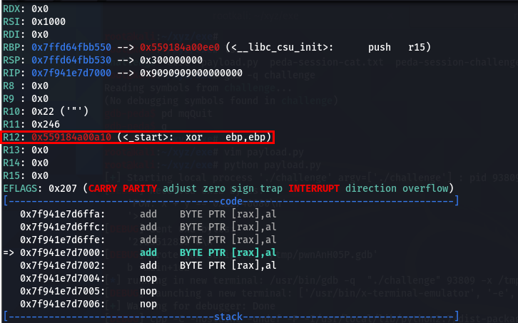 ๋๋ main์์ mapping๋ memory๋ก jump ํ ๋ r12๊ฐ _start๋ฅผ ๊ฐ๋ฆฌํค๊ณ ์๋ค๋ ์ ์ ์ด์ฉํด add instruction์ ์ด์ฉํ์ฌ ๋ฌธ์ ๋ฅผ ํด๊ฒฐํ์๋ค.