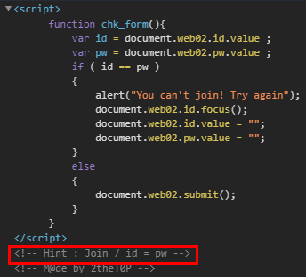 근데 해당 Javascript는 id와 pw를 입력받아 id == pw면 틀렸다고 적혀있다. 모순이다.
