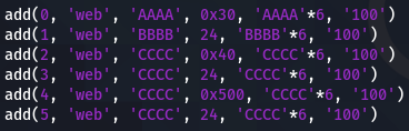 add(7, 'web', 'FFFF', 0x40, 'W'*0x40, '100')