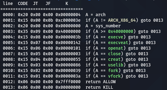 It's a secomp bypass problem. The allowed syscalls are as follows.