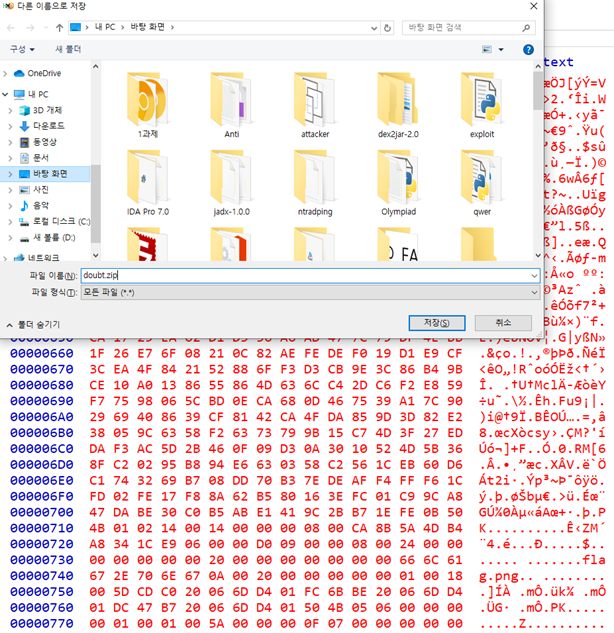 위에 빨간 박스로 표시된 곳을 보면 0x50 0x4B 0x03 0x04로 .zip파일 헤더 시그니처가