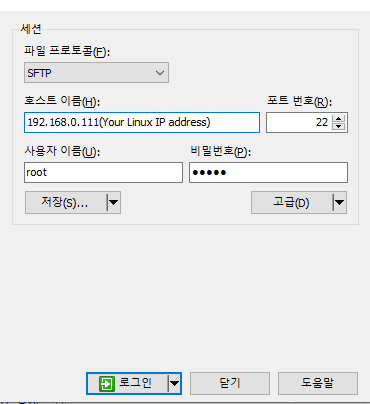 이제 WinSCP를 실행해서 다음과 같이 입력하자.