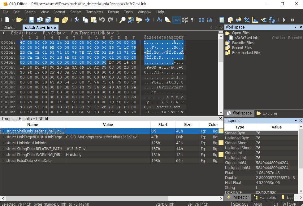 이제 다른 키 값들을 찾기 위해 lnk 파일을 010 Editor을 이용해 분석해보자.