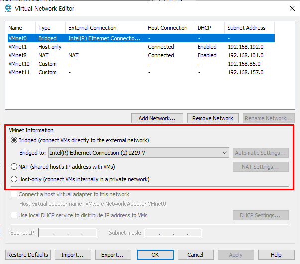 VMnet Bridge 모드는 자신의 Local PC에 장착되어 있는 네트워크 어댑터와 VMnet을 연결해 사용하는 모드이다.