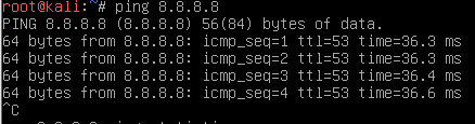 root@kali:~# ping 8.8.8.8 (Ctrl + C로 탈출할 수 있다.)