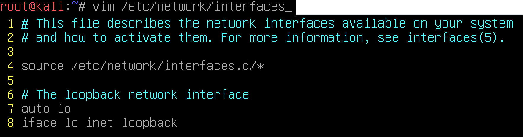 root@kali:~# vim /etc/network/interfaces (vim이 없다면 vi, nano로 해도 무관)
