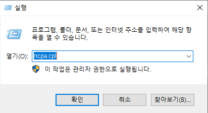 그리고 실행(Win + R)에 들어가 ncpa.cpl을 입력한다.