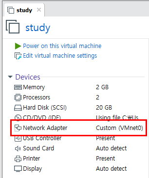 아까 설정했던 VMnet 번호로 Network Adapter을 바꿔주자. 나는 원래 VMnet0 이기 때문에 계속 진행하겠다.